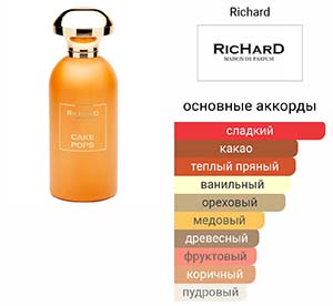 Шоколадно-ореховое, пудровое начало аромата Richard Cake Pops дарит шелковисто-пряный аромат апельсинового цвета, бархатистую пряность корицы, запах какао и сладость ванили. Сладкое сердце композиции демонстрирует запах лесного ореха, ваниль, терпковатый аромат жасмина и тонкий запах спелого ананаса. Тогда как теплый сливочный шлейф парфюма сплетен из запаха меда, мускуса и ванили.